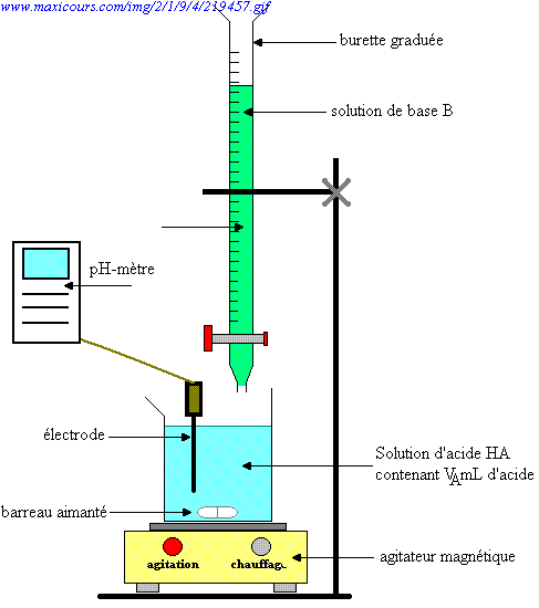 Les acides et les bases sont des substances antagonistes qui réagissent en solution, formant de l'eau et un sel au cours d'un phénomène appelé neutralisation. Exemple : HCl + NaOH Soit en détail : HCl + H2O La neutralisation n'est donc rien d'autre que la réaction entre les ions H3O+ et OH– avec formation d'eau. Une technique très utilisée en chimie est basée sur le principe de la neutralisation d’un acide par une base (ou inversement). Elle permet de doser un acide ou une base au cours de ce que l'on appelle un titrage acidimétrique.