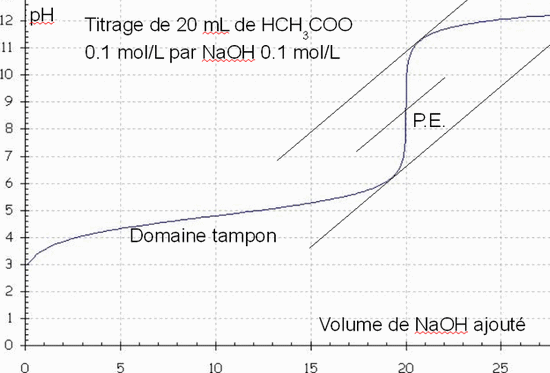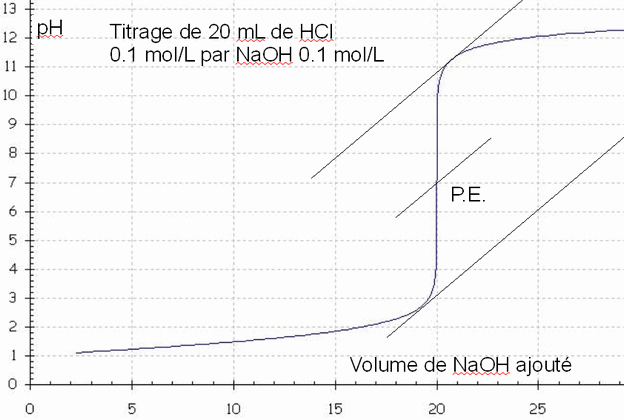 Titrage de HCl 0,1 M par NaOH 0,1 M On prélève une quantité déterminée de HCl 0,1 M, par exemple 20 ml. Pour neutraliser complètement ces ions H3O+, il faut une quantité équivalente d’ions OH– soit par exemple 20 ml de NaOH 0,1 M.Ces 20 ml vont être ajoutés par petites quantités successives à l'aide d'une burette. On mesure le pH en fonction du volume de NaOH ajouté et on reporte les mesures sur un graphique et on obtient une courbe de titrage: