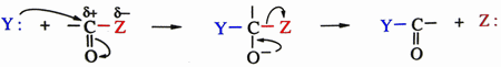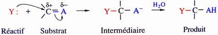 puis une substitution nucléophile par attaque du carbone appauvri en
