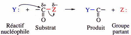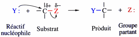 | Substitution nucléophile (SN1 si 2 étapes, SN2 si 1 étape) |