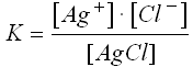 L'expression de K se simplifie lorsqu'il apparaît des corps solides ou liquides dans l'équation chimique. Par exemple quand on met un solide ionique dans l'eau en quantité plus grande que ce que le liquide peu dissoudre, on obtient une situation d'équilibre entre le solide et ses ions dissociés dans le liquide. Par exemple avec AgCl qui est un produit ionqiue très peu soluble dans l'eau:
