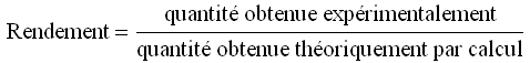Rendement: Quantité de substance réellement obtenue par rapport à la quantité que l'on devrait obtenir. Par exemple, par réaction on devrait obtenir 100 g de NaCl, mais on en obtient que 28 g, le rendement est alors de 28%