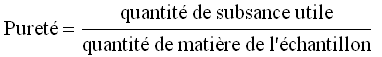 La chimie est une science expérimentale, on travaille avec des produits qui ne sont pas toujours purs et en plus, on peut obtenir des quantités plus faibles de produits que prévu (s'il y a des pertes par projection par exemple). Pour tenir compte de ceci, on définit: Pureté: Quantité de la substance chimique utile par rapport à la quantité de matière utilisée. Elle s'exprime en général en %. Par exemple du NaCl à 98 % signifie que l'on a 98 g de NaCl quand on pèse 100 g d'échantillon.