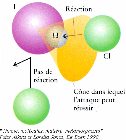 Pour qu'une réaction entre deux molécules se produise il faut naturellement qu'elles s'entrechoquent. Si ce choc n'est pas assez violent ou que l'angle n'est pas bon, les deux particules "rebondissent" sans réagir.